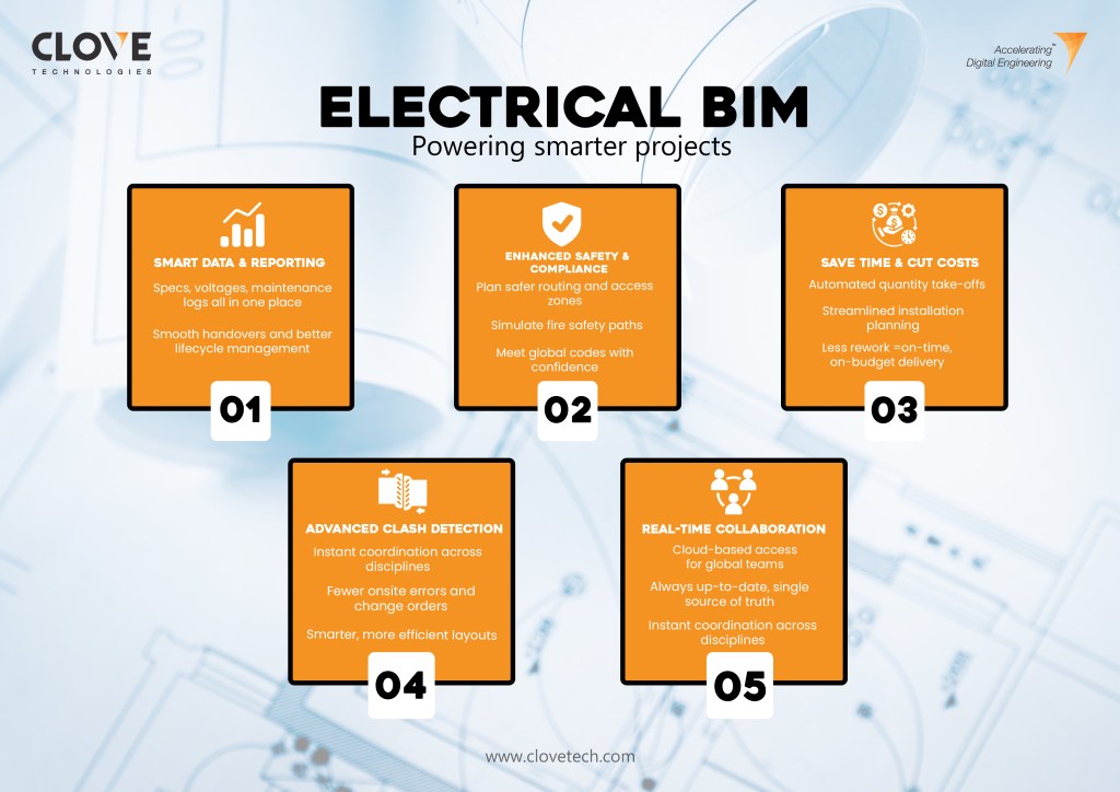 BIM for electrical systems integrates with HVAC, plumbing, fire protection, and structural elements detecting design clashes early. This helps: