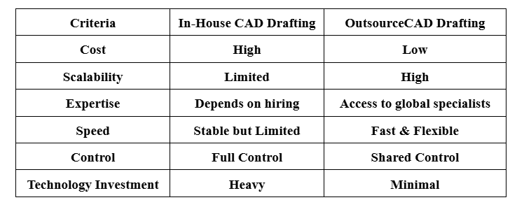 Both options add value, but outsourced CAD drafting enables businesses to adapt faster, manage workloads efficiently, and access specialized expertise without heavy overhead budget and long-term goals can make a massive difference in productivity and project quality.